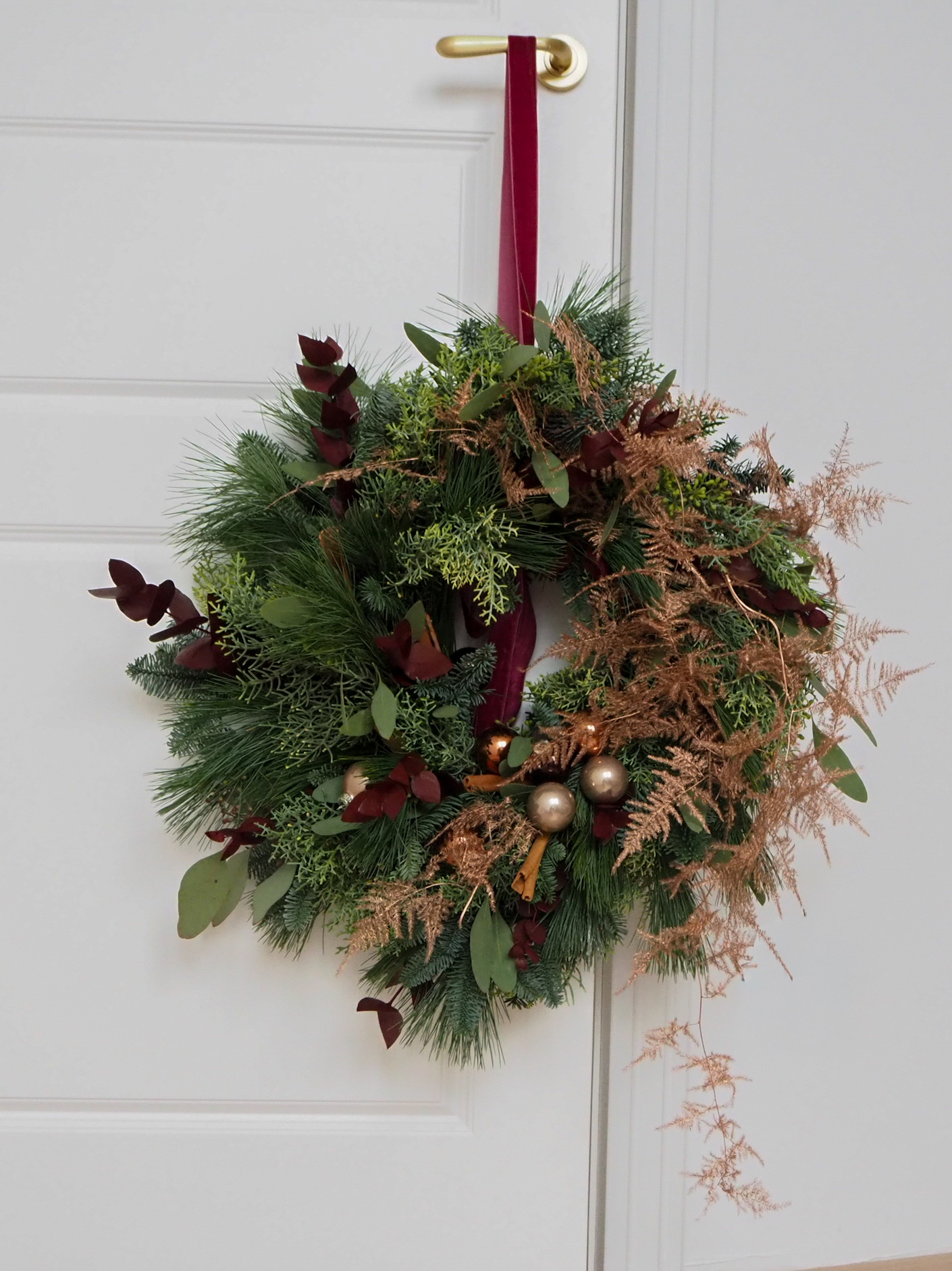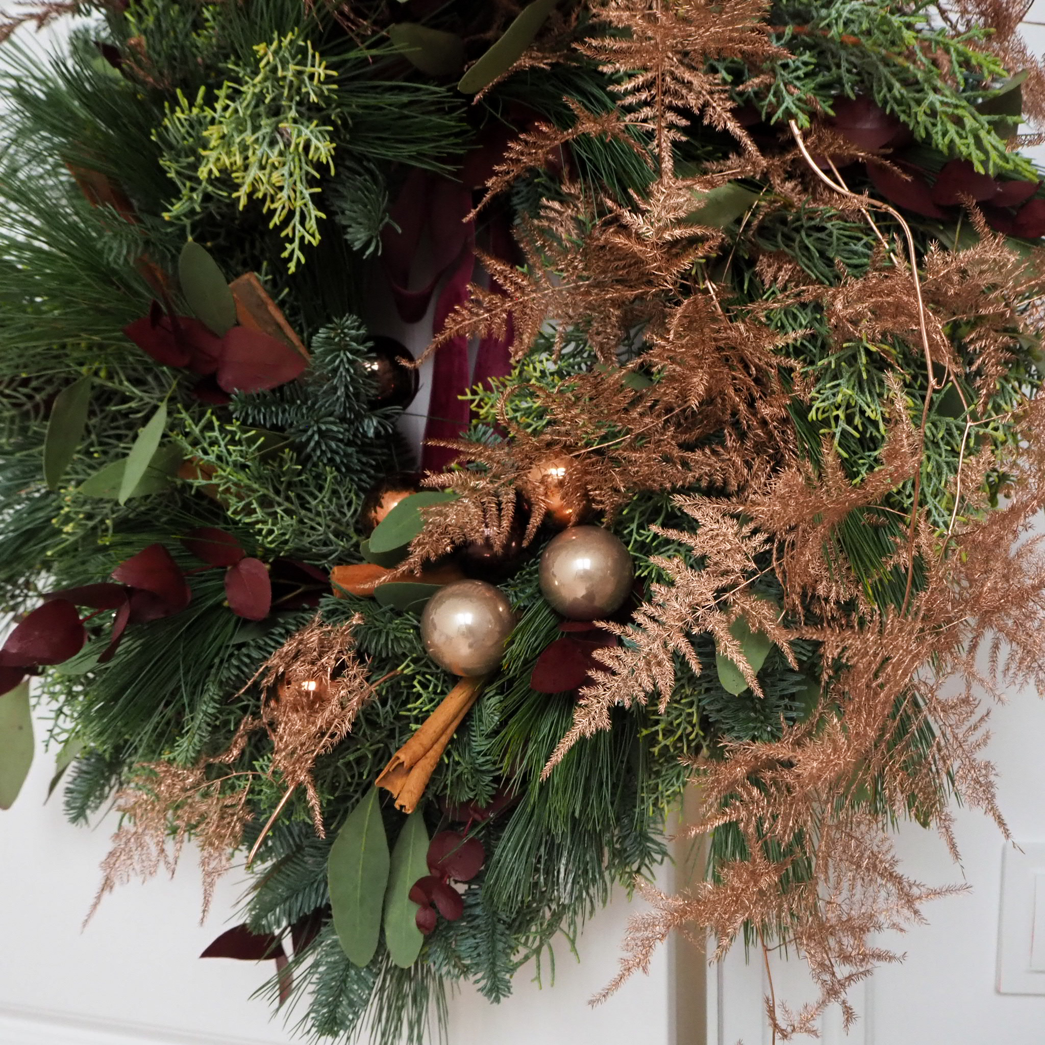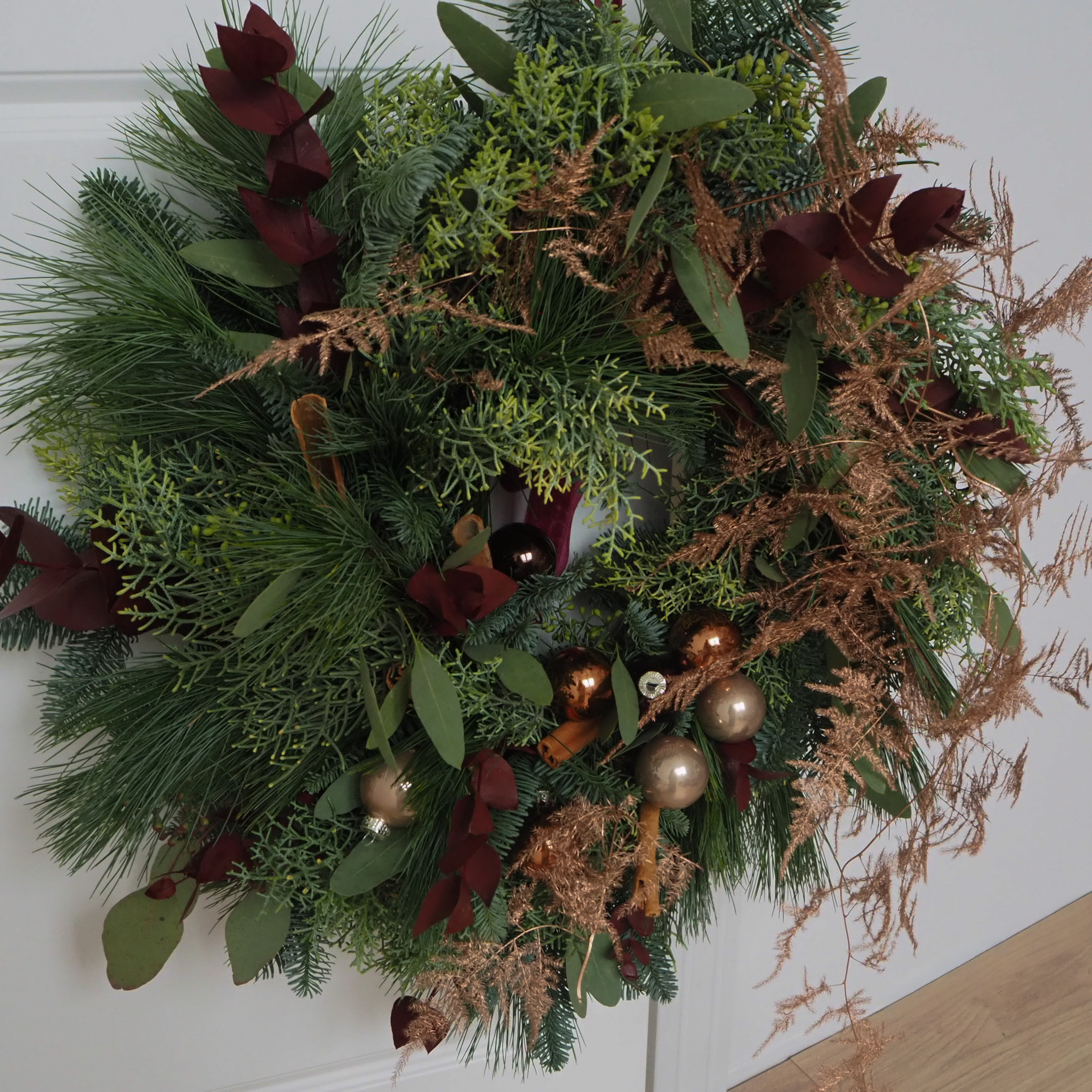 Całość dopełniają brązowe akcenty oraz delikatne gałązki asparagusa w miedzianych odcieniach. Cynamon oraz burgundowe akcenty eukaliptusa — dzięki temu wianek prezentuje się luksusowo, ciepło i niezwykle świątecznie.