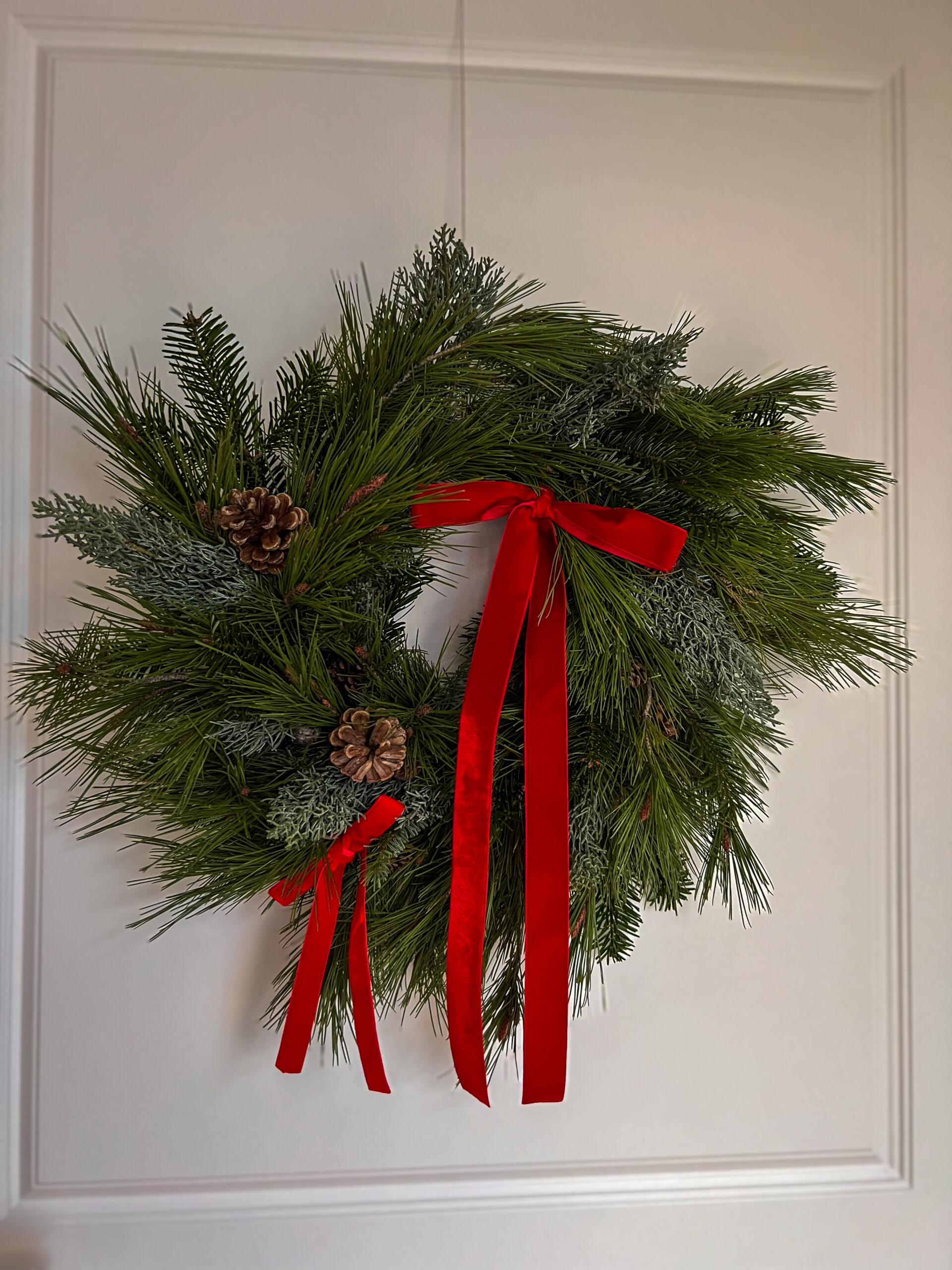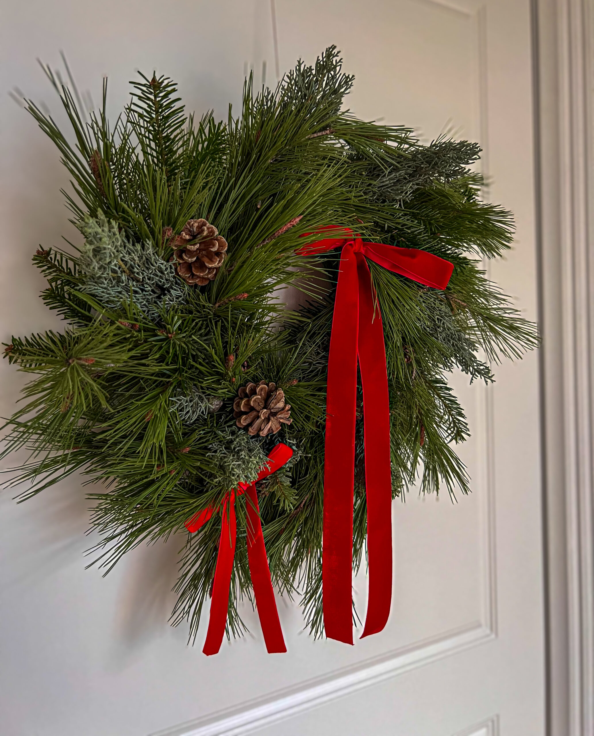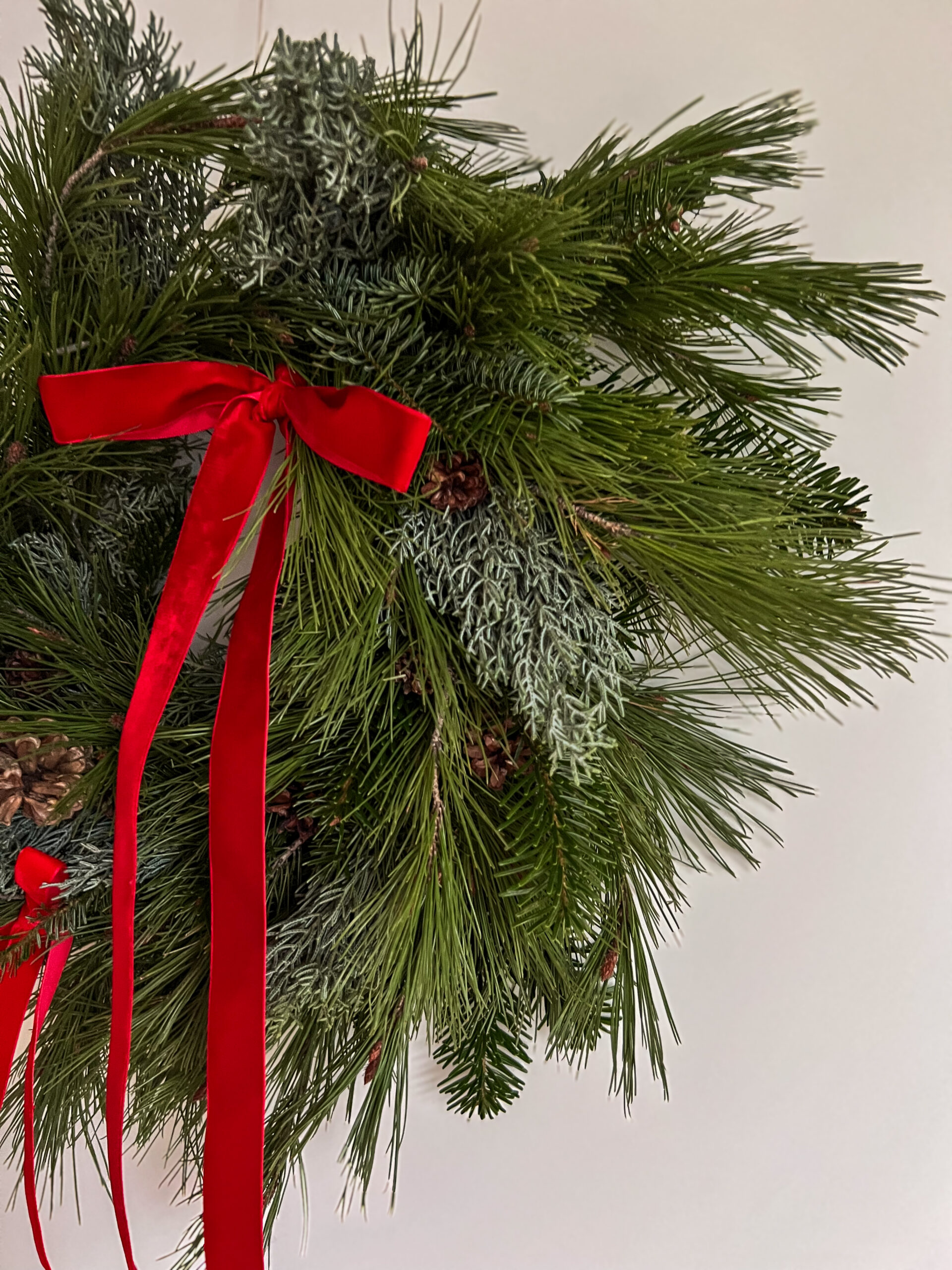 Velvet Noel, to wianek świąteczny wykonany z żywych gałązek jodły kaukaskiej, sosny wejmutki i cyprysu, ozdobiony aksamitną czerwoną wstążką oraz naturalnymi szyszkami. około 40cm średnicy