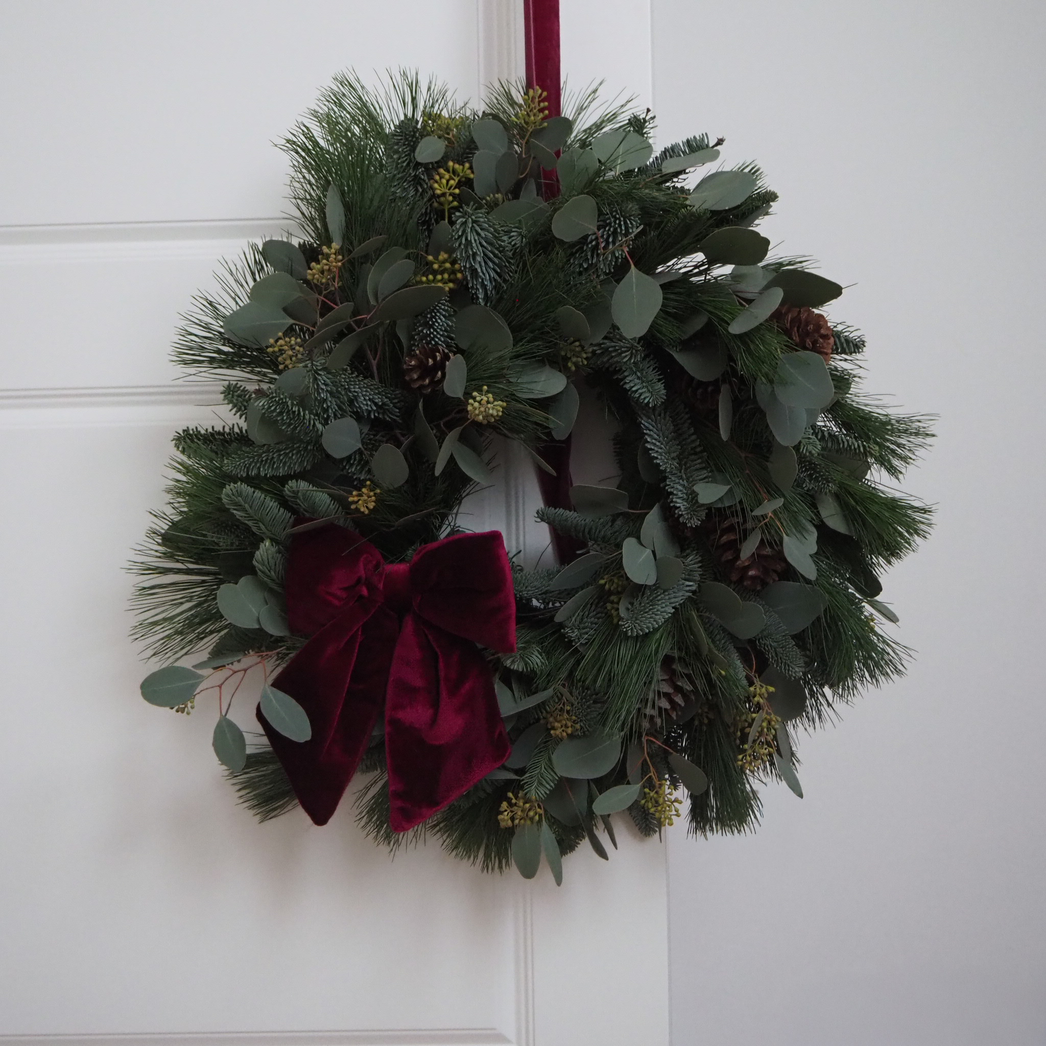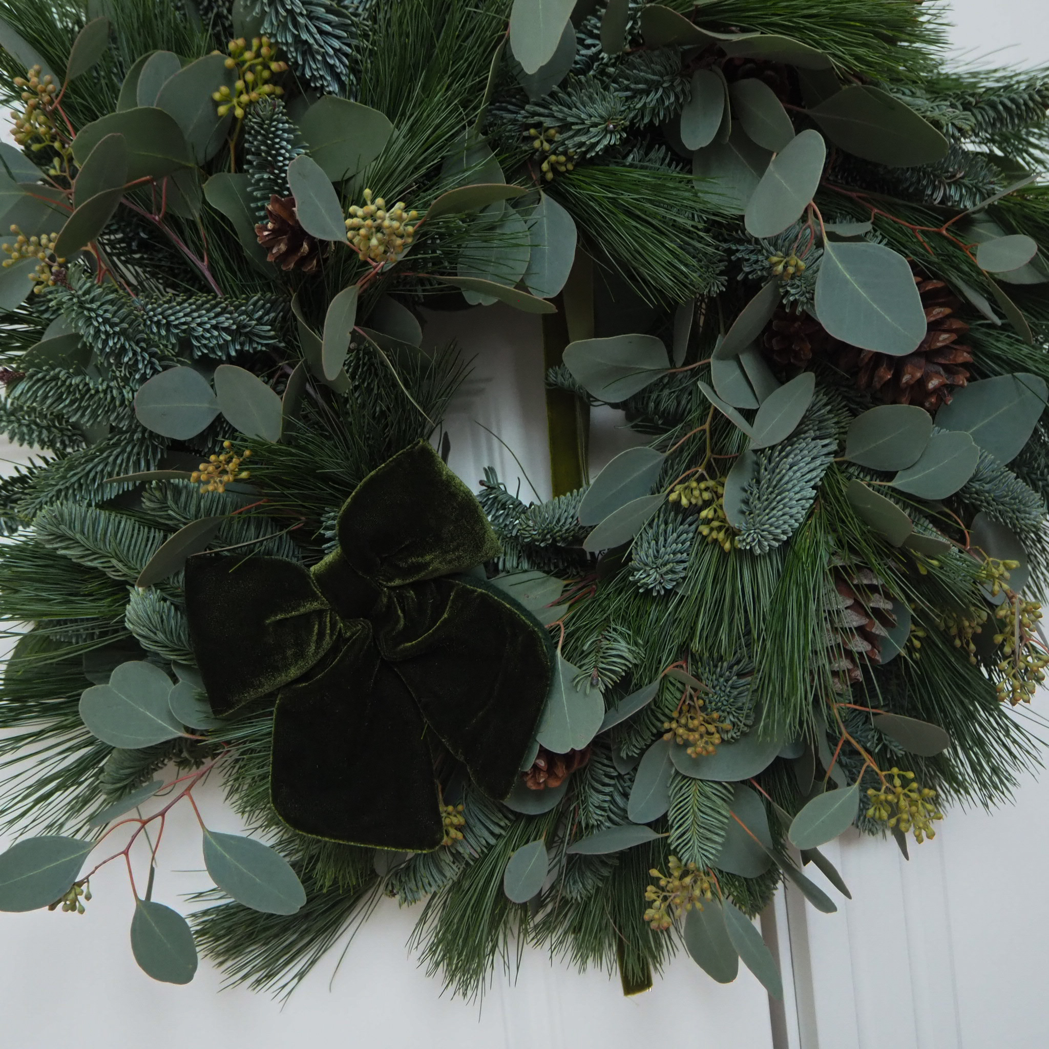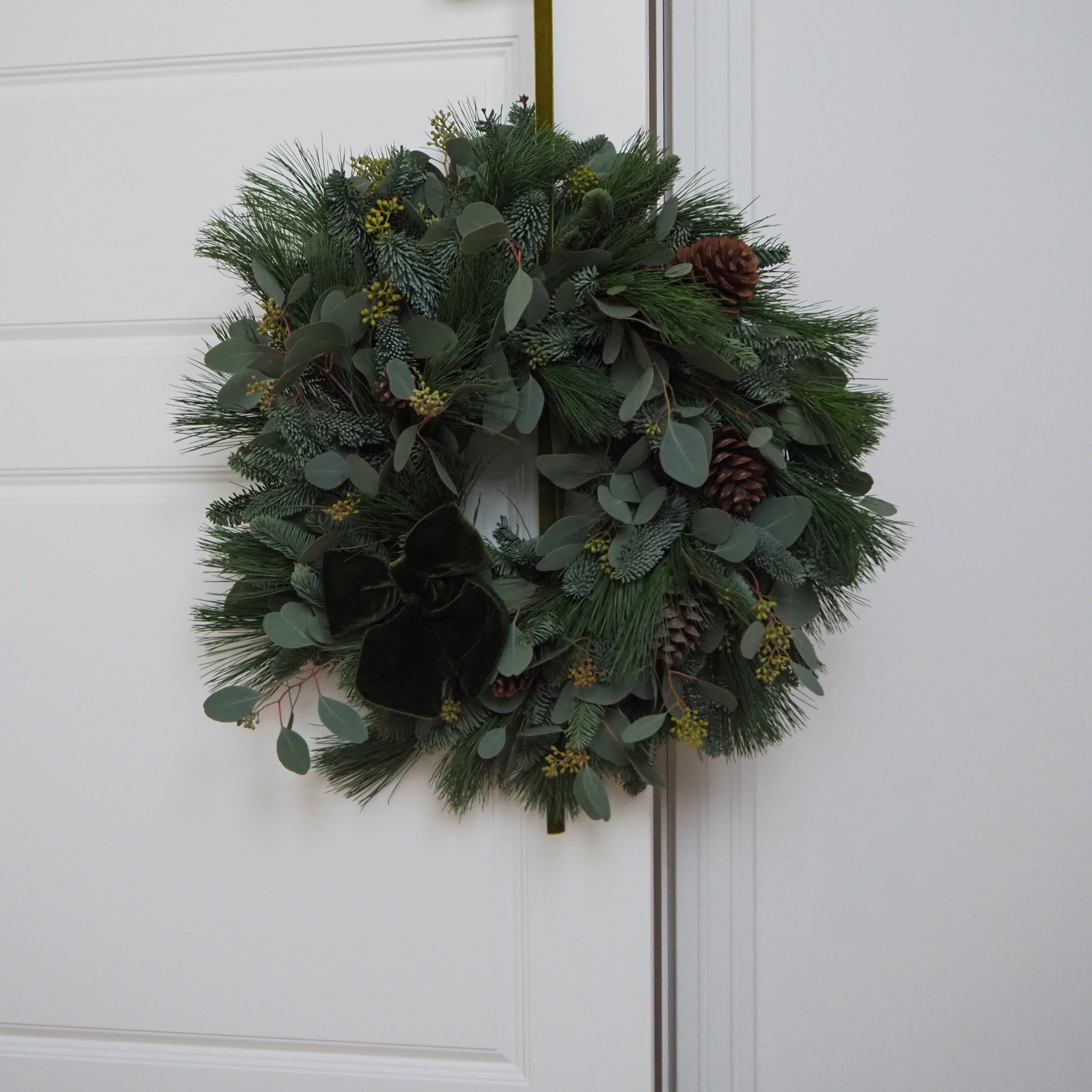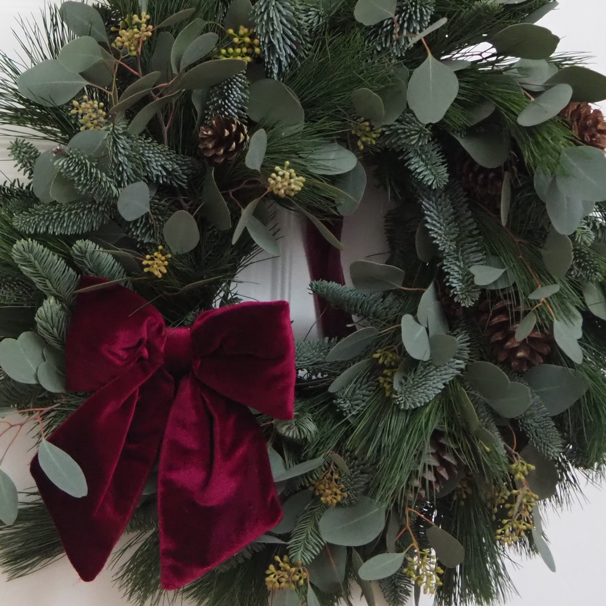 Wykonany z żywych gałązek jodły, sosny i eukaliptusa, ozdobiony szyszkami oraz miękką aksamitną kokardką, która jest hitem dekoracji w tym sezonie.